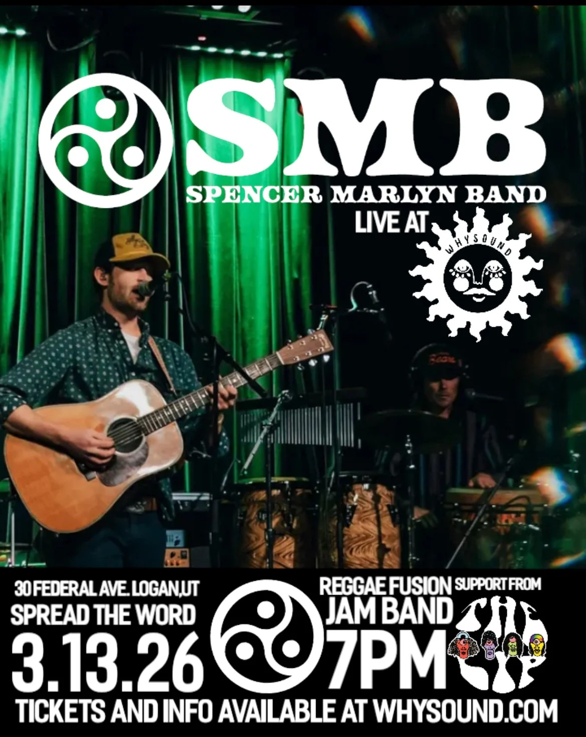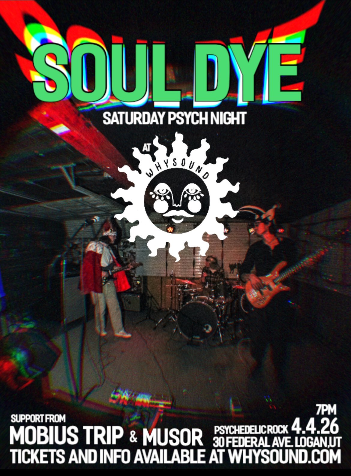 Soul dye is a power trio that plays psychedelic rock from SLC,UT. Inspired by the mountains of northern Utah, Pink Floyd, and Jimi Hendrix, this band always brings the crowd into a trance, groovy waves of lush tones with shooting star slide guitar frontman Bryce Walker. The soft melodies, waterfalls, and blues runs are strongly supported by his rock solid rhythm section with the expert bassist Joe McDaniel (of seeking the sun) and Wayne Aggen (of the lip) on the drums. To fathom hell or soar angelic take a pinch of psychedelic downtown in Logan on 4.4.26 with Soul Dye at the Saturday Psych Night!